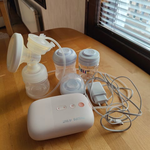 Vähälle käytölle jäänyt philips avent rintapumppu. Settiin kuuluu myös tuttipullo, mutta on ollut kovassa käytössä. Saa toki mukaan jos haluaa. Lansinoh maidonkerääjä, ollut enemmän käytössä. Silikonin avulla pysyy paikoillaan.
