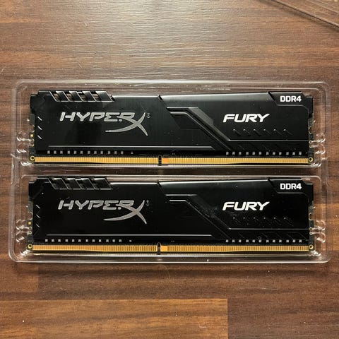 Hyvässä kunnossa olevat DDR4 RAM-tikut. Kumpikin 8GB, eli yhteensä 16GB muistia.
