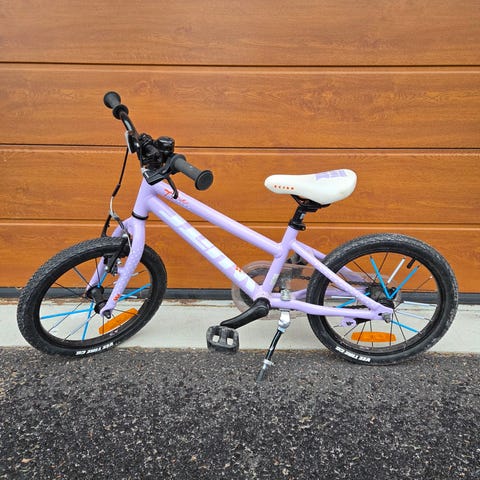Madison Helmi lastenpyörä etukorilla ja nuken istuimella. Vasemmalla puolella edessa kaatumisesta naarmu, muuten ei naarmuja. Nukenistuimen remmi kadonnut.