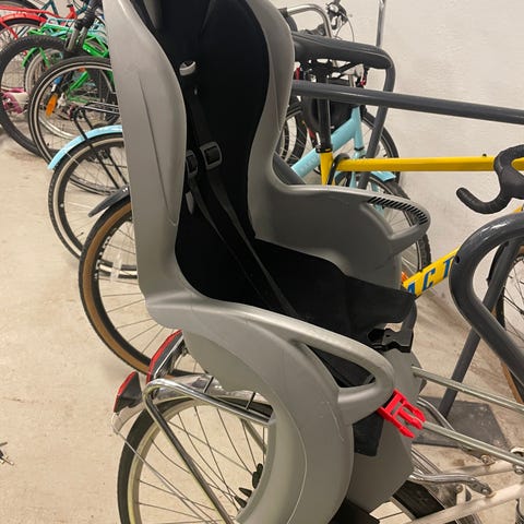 Bobike lastenistuin pyörään. Selkänojan saa laskettua alas, kun istuin ei ole käytössä. Jalkatuet, turvavyö. Kätevä ja helppokäyttöinen.