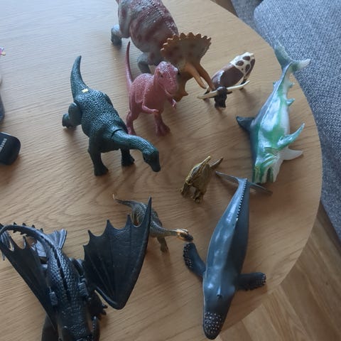 Maaeläimiä, merieläimiä ja dinosauruksia. Muovia. Myydään yhtenä kokonaisuutena.