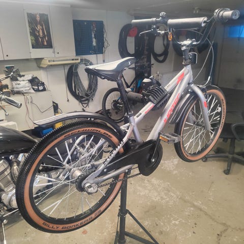 Lasten 20" polkupyörä. Maalattu violetiksi. Käytön jälkiä on reilusti, mutta kaikki paitsi vaihteet toimii. Pienimmällä vaihteella on kuitenkin ollut hyvä polkea.