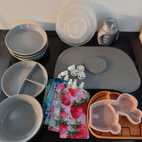 Liewood luonnonvalkoinen lasten astiasetti bambua. Settiin kuuluu matala lautanen, syvä lautanen, muki ja lusikka. Pientä kulumaa mustissa osissa, mukin reunassa pieni virhe, näkyy kuvissa.