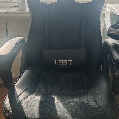 Vanha AK Racing pelituoli, käytön jälkiä on toisessa käsinojassa. Selkänoja vähän väljä mutta silti toimiva tuoli. Kissatalous.