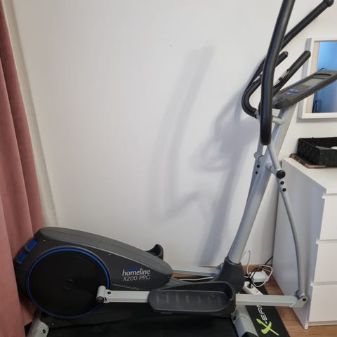 Crosstrainer koti- tai kuntokäyttöön. Laitteessa on käsikahvat, poljinalustat ja vauhtipyörä edessä. Väri on harmaa-valkoinen vihrein yksityiskohdin. Soveltuu aerobiseen harjoitteluun ja koko kehon lihaskunnon ylläpitoon sisätiloissa.