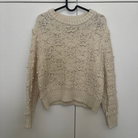 Ihanan pehmeä ja kauniisti laskeutuva luonnonvalkoinen väljä neule, jossa 3/4 batwing hihat. Koko K, mutta sopii hyvin myös M koolle. Kuvissa koon S/36 koon mannekiinilla.