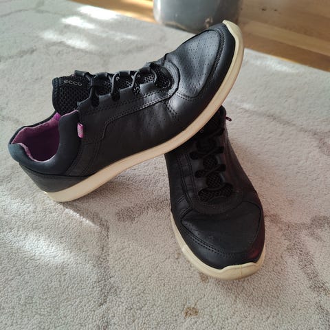 Ecco-merkkiset naisten mustat tennarit, materiaali aitoa nahkaa. Joustavat nauhat, vaaleat hyvin pitävät pohjat.