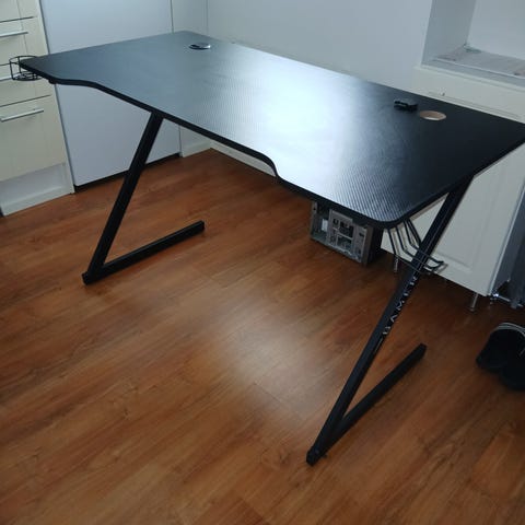 Pelipöytä muuton tieltä pois, pöydän päältä pintamateriaalia lähtenyt pois ja pinnassa myös kynsiliiman jäämiä. Keskimmäisessä kuvassa näkyy jälki.