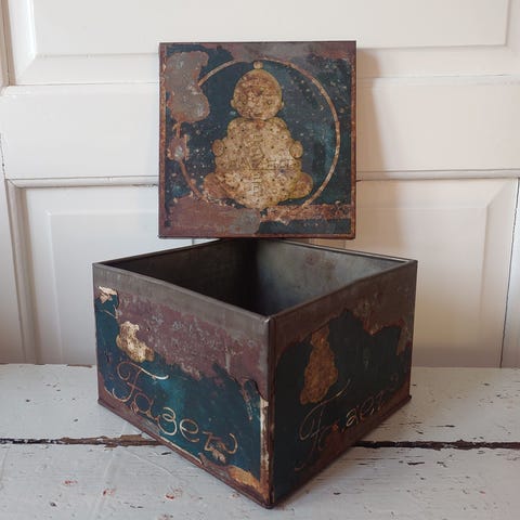 Kuvan hyväkuntoinen peltinen rasia. Kannessa hieno ruusukuvio.