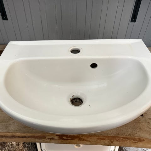 Remontin alta pois. Oli liimattu seinään ja siksi takana olevaa tukea ei enää ole kaapissa. Pienellä korjauksella toimiva allas. Ehjä vaikkakin likainen. Mitat: K: 680mm, L:500mm S: 390mm. VAIN NOUTO!