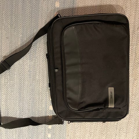 Olkalaukku kannettavalle tietokoneelle, useita taskuja vetoketjulla ja ilman, tukeva olkahihna ja pohjassa suojakannakkeet. Sisällä erillinen pehmustettu suojakangas tietokoneelle. Hyväkuntoinen.