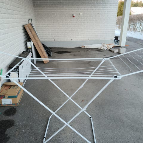Valkoinen metallinen pyykkiteline sisäkäyttöön. Hyvä kuntoinen, myydään koska ei enää tarvetta.