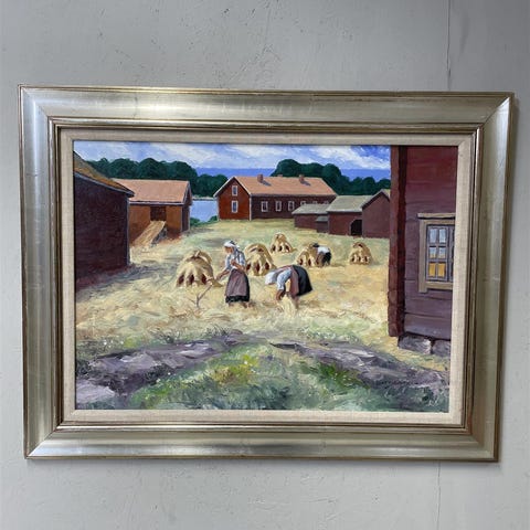 Öljyvärimaalaus kankaalle, signeerattu Leo Pahlama -34. Teos esittää maaseutumaisemaa, jossa on heinäseipäitä ja taustalla metsää. Kehystetty koristeellisella kehyksellä.