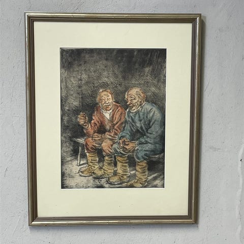 Taiteilija Oki Räisänen Etsaus ”Hiihtävät metsästäjät”. Signeeraus O Räisänen -29
