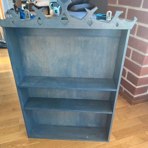 Pieni puusepän tekemä antiikinsininen hylly. Tosi tukeva, mutta maalissa jo sanomista voin ottaa kuvia tarvittaessa. Ollut meille sekä seinällä, että lattialla.