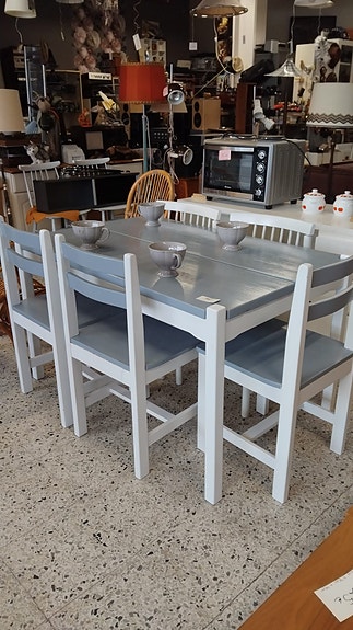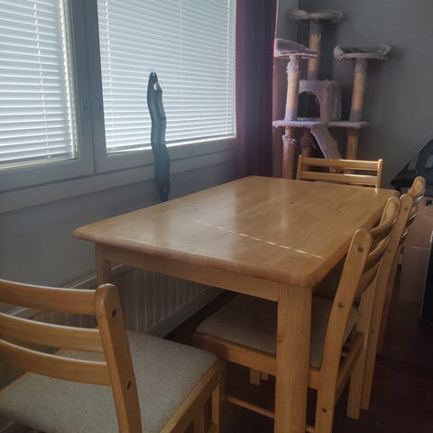 Pöydässä tulee päädystä 40 cm jatkopala, saa tarvittaessa helposti lisää pinta-alaa. Tuolit on vanhat, mutta ne on kunnostettu.