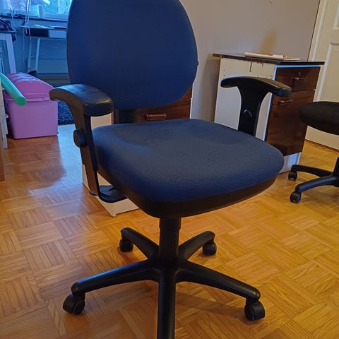 Toimistotuoli, musta, 5-sakarainen jalka, istuin osa 46 x 41 cm, selkäosa 43 x 41 cm, istuin osassa valkoista "nöyhtää", lähtee pois erikseen nyppimällä