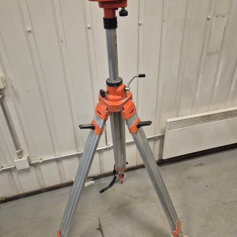 Lasermittauslaite, kantolaukulla. Settiin kuuluu kolmijalkajalusta, laser-yksikkö, pyörivä asteikollinen alusta kulmien mittaamiseen sekä vesivaaka.