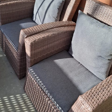 Hyväkuntoiset puutarhapöytä ja kaksi tuolia.