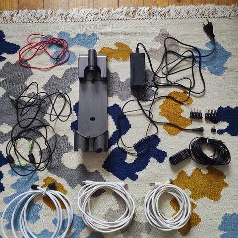 Dyson antennikaapeli ja jakajat. Pakettiin kuuluu koaksiaalinen antennikaapeli sekä useita metallisia antennijakajia ja liittimiä. Sopii televisio- ja datakaapeloinnin kytkentöihin, joissa käytetään koaksiaalikaapelia ja F- tai koaksiaaliliittimiä. Tarkat pituudet ja tekniset arvot eivät käy ilmi kuvista.