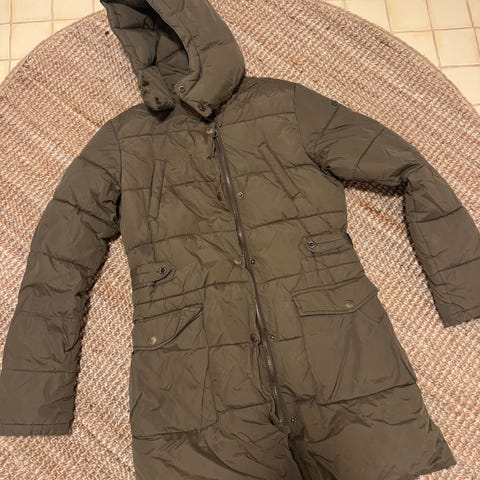 Käytetty erittäin lämmin untuva70% ,höyhen30%, takki,suklaan ruskea,kangas ehyt vuori ja päällys ehyt ainoastaan vois tarvita pesun,