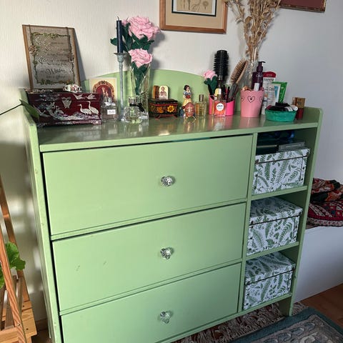 Valkoinen puhelinpöytä jossa vihreä pehmuste.