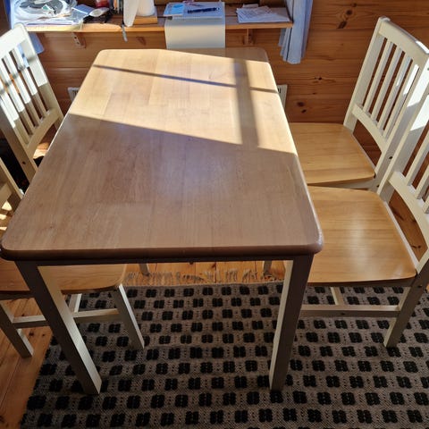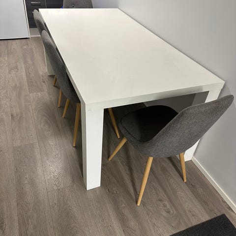 Käytössä olleet puolivuotta. Pöytä tahrainen mutta saa pestyä. Ollut minulla yksiössä, mutta koen ruokapöydän tarpeettomaksi omassa käytössä.