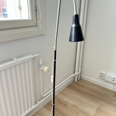 IKEA Kvart musta seinälamppu taivutettavalla varrella. Virtajohto on valkoinen välikytkimellä. Toimiva valaisin, mustassa kuvussa pientä jälkeä, ei vaikuta käyttöön.