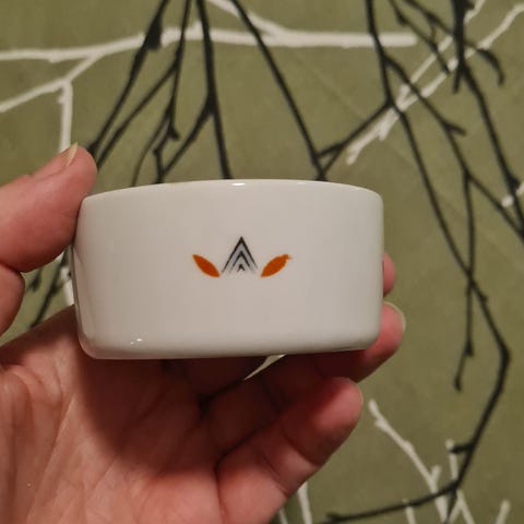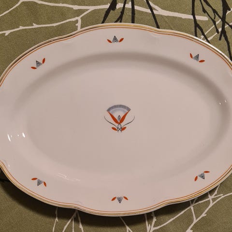 Arabian Egypti-sarjan neliskulmainen tarjoiluvati piippuleimalla (n. 1930-40-l.). Tyydyttävä kunto. Pohjan kuvio kulunut pahasti, sivujen kuviot hyväkuntoisia. Kultaus pahasti kulunut. Yhdessä kulmassa kuvanmukainen lohkeama. Sivu n. 16,5 cm.