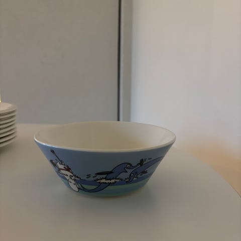 Hyvässä kunnossa oleva muumikulho Muumipeikkokuvituksella.