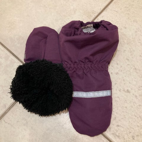 Lilat topatut hanskat loskakaleihin. Koko 1, mutta reilut, olleet 3-vuotiaalla/98 koossa.