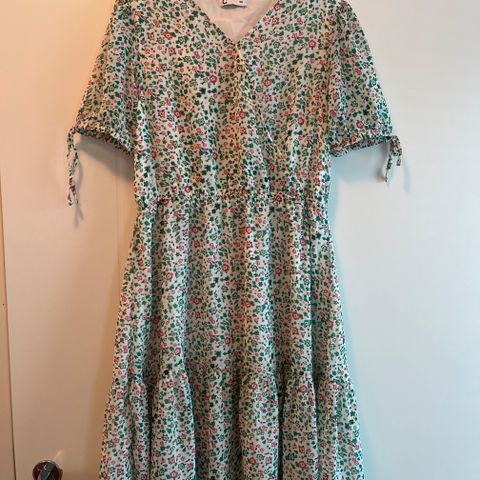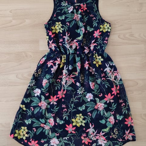 Kaunis juhlamekko kukkakuviolla. Kokomerkintä puuttuu mutta oli sopiva 158/164 cm vaatteiden aikaan ja sopinee myös isommalle, koska selkäpuolella kangas joustaa rypytyksen ansiosta.