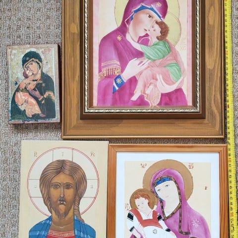Ikonitaulu, jossa pyhimysaiheinen uskonnollinen kuva. Värillinen maalaus esittää pyhää henkilöä vuorimaisemassa, mukana myös eläinhahmo ja pieni ikoni yläkulmassa. Taulu on suorakaiteen muotoinen ja siinä on ripustuslenkki takana seinälle kiinnittämistä varten. Sopii esimerkiksi kodin sisustukseen tai hartauskäyttöön. Käsinmaalattu.