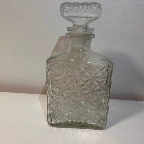 Lasinen karaffi, jossa on hiottu ristikkokuvio ja lasinen tulppakorkki. Sopii esimerkiksi juomien, kuten viinin tai väkevien, tarjoiluun tai säilytykseen. Kirkas lasi ja koristeellinen muotoilu tekevät siitä käyttö- ja sisustusesineen.