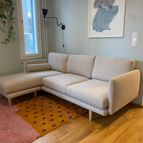 Finnsoffat Havu, super kestävässä Yedi- kankaassa (todella helppo pestä, ei kutistu tms vaan helppo laittaa takaisin paikalleen). Ostettu tasan 3 vuotta sitten, josta ollut reilu 2 vuotta käytössä (oli lämpimässä varastossa suojattuna 9kk välissä toisen sohvan tieltä). Leveys 216cm. Untuvatäyte.