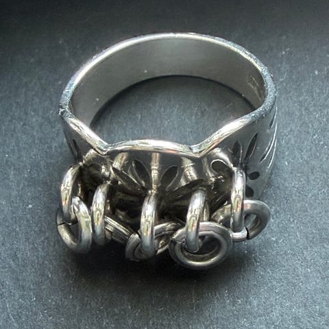 Kalevala Karjaan sormus materiaalina hopea. Sormuksessa on leveä, useasta nauhamaisesta osasta koostuva muotoilu. Leimat KK/925/C9.