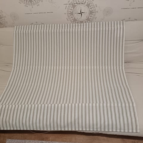 Verhot, jossa on sinisen, vihreän, harmaan ja beigen sävyinen siksak-kuvio. Sopii ikkunaverhoksi tai sisustuskankaaksi esimerkiksi olohuoneeseen tai makuuhuoneeseen. Materiaali vaikuttaa olevan kudottua kangasta.