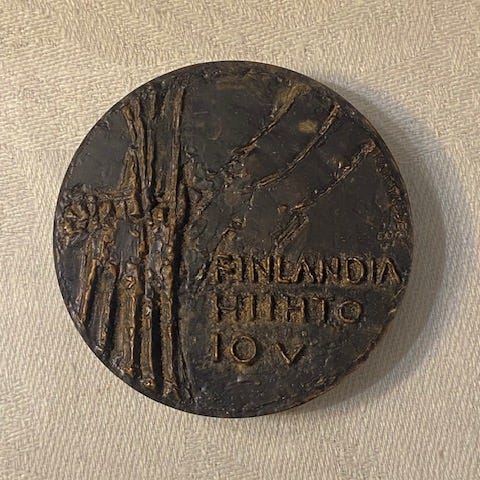 Finlandia-hiihdon mitali vuodelta 1985. Paino n. 100 g. Pyörinyt laatikon pohjalla, joten pinnassa pieniä kulumisen jälkiä.