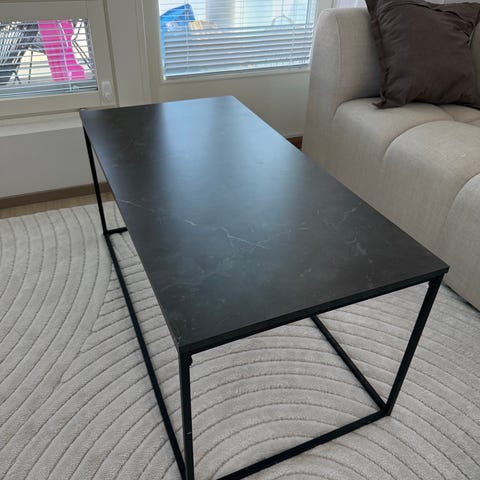Jyskin musta marmori kuviollinen sohvapöytä, yksi kulma hieman repsottaa mut saa varmasti liimattua tms.