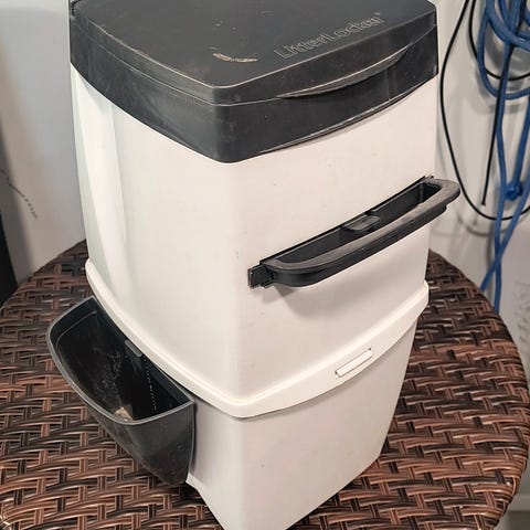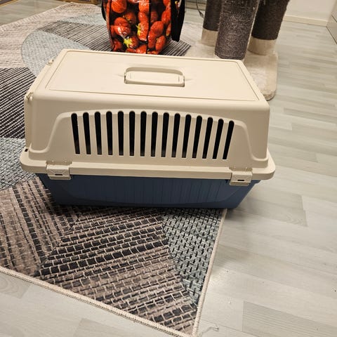 Valkoinen metallinen kissankuljetus koppi ja 10l Cushida kissanhiekkaa (Lidl)