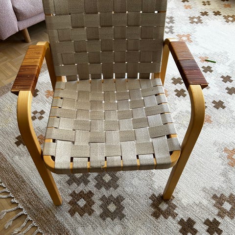 Alvar Aallon suunnittelemat klassikkotuolit. Runko jämäkkä ja vyöt napakat. Vöissä pieniä tahroja (en ole yrittänyt poistaa). Yleisilme kuitenkin siisti, kts. kuvat.