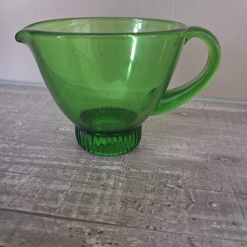 Riihimäen lasin pieni lasinen kirkas kermakko, jossa on kaiverrettu koristekuvio ja kaatonokka. Varustettu korvalla helppoa kaatamista varten. Soveltuu esimerkiksi kerman, maidon tai kastikkeiden tarjoiluun. Korkeus n.10cm.