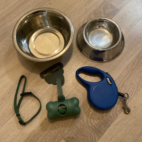 2 talutushihnaa, panta, muutama pissa-alusta, koirankakkapusseja, kynsisakset, tossut, ruokakuppiteline johon sopii halkaisijaltaan 11cm kupit.