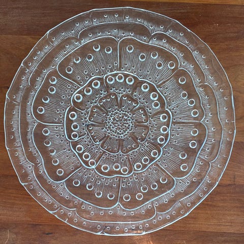 Ryszard Serwickin suunnittelema ja Ząbkowicen lasitehtaalla valmistettu vintage Patera Flora -tarjoilulautanen.