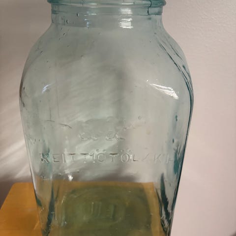 Myynnissä kaunis vanha lasipurkki Karhula keittiötölkki 1L. Mitat: suun halkaisija 10,5cm, pohja 13x13cm, korkeus 13,5cm. Purkki on ehjä, lasissa on näkyvissä ilmakuplia ja pohjassa kulumajälkiä. Kansi on toisesta tuotteesta Ilves purkista. Nouto Vuosaari / toridiili / postitus perinteisesti + pk:t. Maksu MobilePay / käteinen tasaraha. Koiratalous, MMM, kts muutkin tuotteeni
