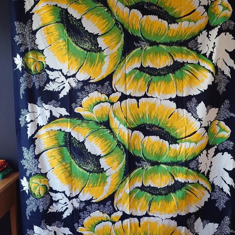 Vihreä verho, vihreä pöytäliina, retro verho, 70-luvun verho, 70-luvun kangas, retro kangas