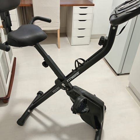 Harmaa kuntopyörä kotikäyttöön. Laitteessa on satula, polkimet hihnakiinnityksellä sekä ohjaustanko, jossa on näyttö harjoittelutietojen seuraamiseen. Soveltuu sisätiloissa tehtävään kunto- ja peruskestävyysharjoitteluun.