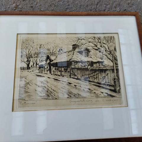 "Petissan" etsaus, joka on kehystetty koristeelliseen kehykseen. Teos esittää talvista katunäkymää, jossa on vanhoja rakennuksia ja paljaita puita. Alareunassa on signeeraus ja merkintä 'Original etsning av E. Hällgren'.