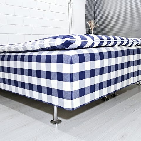 Hästens Superia II jenkkisänky sinivalkoisella ruutukuvioisella verhoilulla. Sängyssä on yhtenäinen, vaalea päällinen ja tukeva runkorakenne, jonka alla puinen kehikko ja tukirimat. Sopii kahden hengen sängyksi makuuhuoneeseen.