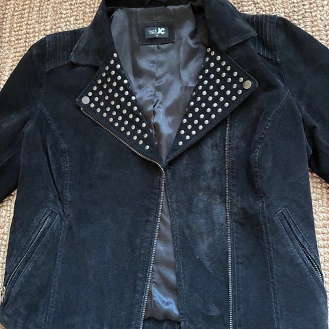 Naisellisesti leikattu lyhyt takki aitoa mokkaa. Isot vetoketjut edessä ja hihansuissa. Helma takaa hieman lyhyempi. Kokomerkintä 40, menee kauniisti 38/40 koolle. Kuvissa koon 36 mannekiinilla, jolle hieman väljä.